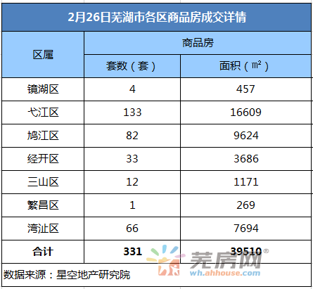 2月26日,芜湖商品房分区域备案情况如下:镜湖区商品房备案4套,共计面积457平米;弋江区商品房备案133套,共计面积16609平米;鸠江区商品房备案82套,共计面积9624平米;经济开发区商品房备案33套,共计面积3686平米;三山区商品房备案12套,共计面积1171平米;繁昌区商品房备案1套,共计面积269平米;湾沚区商品房备案66套,共计面积7694平米。